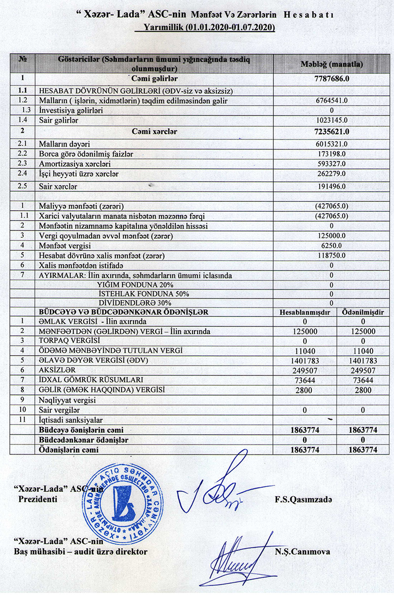 Rusiyanın "AvtoVAZ" Konserninin Azərbaycanda rəsmi idxalçısı “Xəzər Lada” ASC bu ilin 1-ci yarısını 119 min manat xalis mənfəətlə başa vurub.