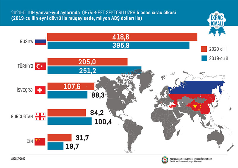 2019-cu ilin müvafiq dövrü ilə müqayisədə 2020-cu ilin 7 ayı ərzində Rusiyaya qeyri-neft ixracı 5,7 faiz, İsveçrəyə 21,9 faiz və Çinə 60,9 faiz artıb.