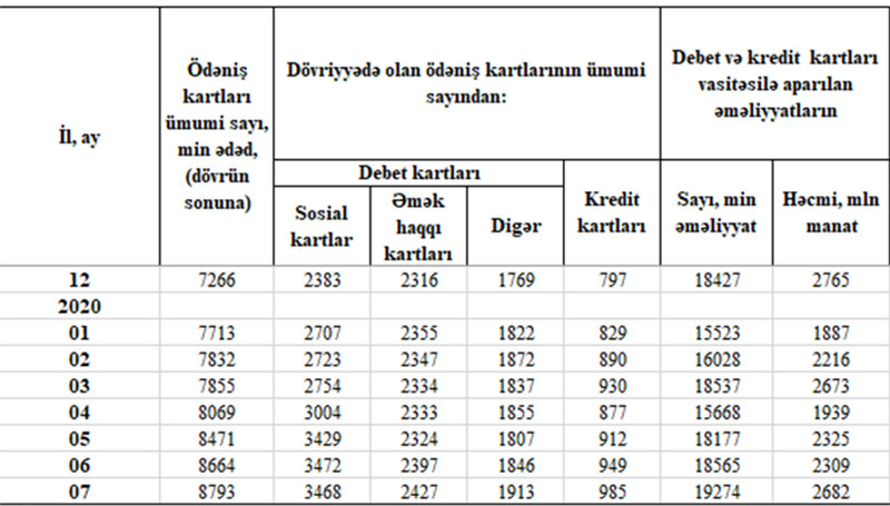 Qeyd edək ki, 2020-ci ilin iyul ayının sonunda cəmi ödəniş kartılarının sayı 8 milyon 793 min ədəd təşkil edib. Cəmi ödəniş kartlarının sayı iyul ayında 129 min ədəd, 7 ay ərzində isə 1 milyon 527 min ədəd artıb. Cəmi ödəniş kartlarının 3 milyon 468 min ədədini sosial kartlar, 2 milyon 427 min ədədini əmək haqqı kartları, 1 milyon 913 min ədədini digər debet kartları təşkil edib.