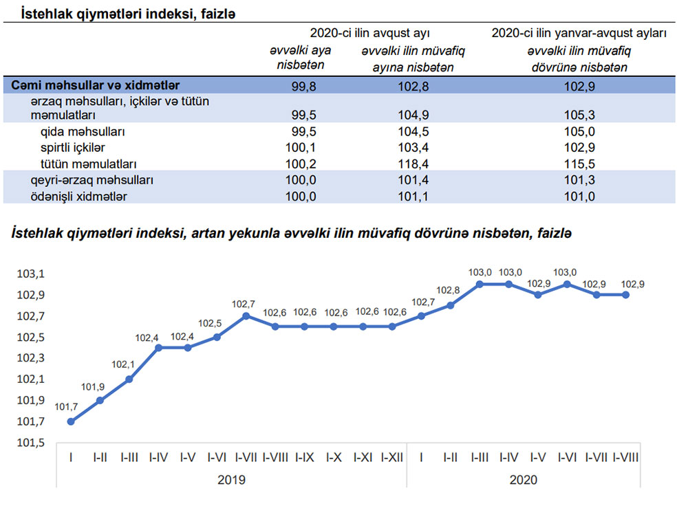 Avqust ayında deflyasiya davam edib. İllik inflyasiya isə 2,9% təşkil edib. İnflyasiya İyul ayında da 2,9% idi.2020-ci ilin yanvar-avqust aylarında istehlak qiymətləri indeksi 2019-cu ilin yanvar-avqust aylarına nisbətən 2,9 faiz, o cümlədən ərzaq məhsulları, içkilər və tütün məmulatları üzrə 5,3 faiz, qeyri-ərzaq məhsulları üzrə 1,3 faiz, əhaliyə göstərilmiş ödənişli xidmətlər üzrə 1,0 faiz artıb.