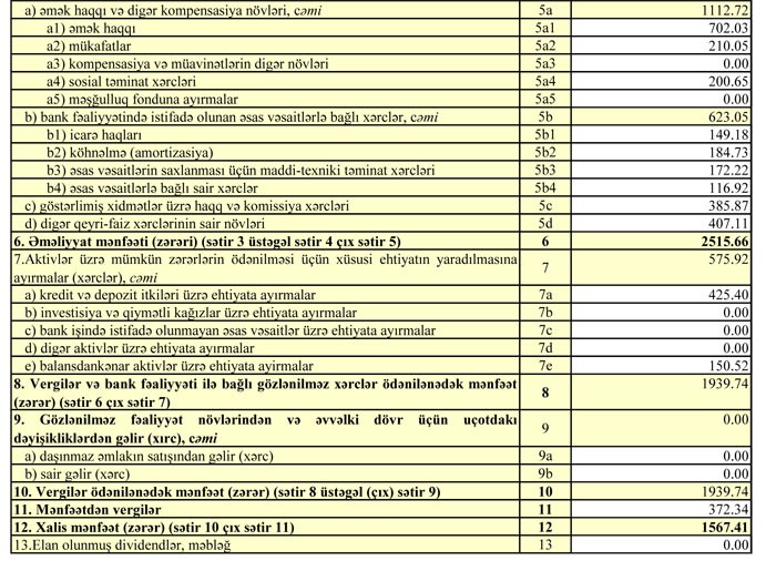 Bu ilin ilk rübündə 2 milyon 515 min manat əməliyyat mənfəətinin 575.92 min manatı aktivlər üzrə mümkün zərərlərin ödənilməsi üçün xüsusi ehtiyatın yaradılmasına ayırılıb. Ötən ilin ilk rübündə Bankın 2 milyon 659 min manat əməliyyat mənfəətinin üzərinə ehtiyatlardan azad edilmiş 568.57 min manat əlavə edilmişdi. Əsasən bu səbəbdən ötən ilin birinci rübündə bankın xalis mənfəəti yüksək olmuşdu.
