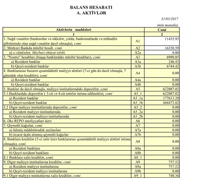 31 Mart 2017-ci il tarixinə “Azərbaycan Sənaye Bankı” 949 milyon 375 min manat cəmi aktivlərə, 862 milyon 547 min manat cəmi öhdəliklərə, 86 milyon 827 min manat cəmi kapitala malik olub. Bank ötən ilin sonunda 787 milyon 179 min manat cəmi aktivlərə, 702 milyon 525 min manat cəmi öhdəliklərə, 84 milyon 653 min manat cəmi kapitala malik idi. Bankın aktivlərinin birinci rübdə 20% artması əsasən ASB-nin digər banklardakı depozitlərinin 442 milyon 675 min manatdan 622 milyon 87 min manata qalxmasıdır (40% artım). 31 Mart 2017-ci il tarixinə olan məlumata görə, ASB-nin depozitlərinin 177 milyon 613 min manatı rezident banklarda, 444 milyon 473 min manatı qeyri-rezident banklardadır. Ötən ilin sonunda Bankın depzoitlərinin 182 milyon 382 min manatı Azərbaycanda, 260 milyon 292 min manatı xarici banklarda yerləşdirilmişdi. Beləliklə, ASB yerli banklardakı depozitini azaldıb, xarici banklardakı depozitini isə artırıb.