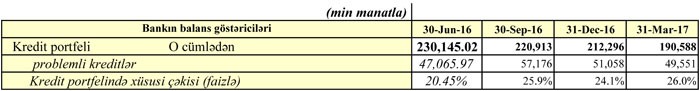 31 Mart 2017-ci il tarixinə olan məlumata görə, 190 milyon 588 min manat kredit portfelinin 26%-i və ya 49 milyon 551 min manatı problemlidir. Lakin Bank verilmiş kreditlər üzrə 55 milyon 154 min manat ehtiyat yaratdığından ödəmə vaxtı keçmiş 49 milyon 551 min manatlıq kredit artıqlaması ilə bağlanır.