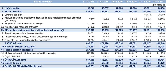 31 Mart 2017-ci il tarixinə Bank Respublika 881 milyon 240 min manat cəmi aktivlərə və 841 milyon 761 min manat cəmi öhdəliklərə malik olub. Bank 2016-cı ilin sonunda 912 milyon 117 min manat cəmi aktivlərə və 871 milyon 793 min manat cəmi öhdəliklərə malik idi. İlk rübdə müştərilərə verilmiş kreditlər 281 milyon 158 min manatdan 249 milyon 108 min manata geriləyib.