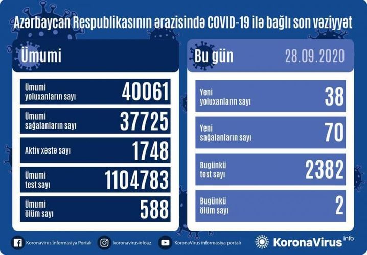 Son 24 saatda Azərbaycan Respublikasında koronavirus (COVID-19) infeksiyasına 38 yeni yoluxma faktı qeydə alınıb, 70 nəfər müalicə olunaraq sağalıb və evə buraxılıb.