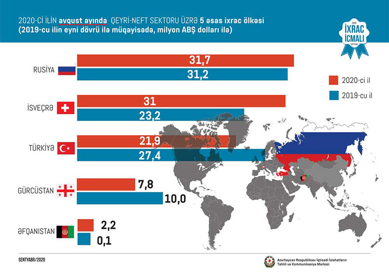 Bu ilin yanvar-avqust ayları ərzində Rusiyaya 450,3 milyon, Türkiyəyə 226,9 milyon, İsveçrəyə 138,5 milyon, Gürcüstana 92 milyon və Çinə 32,7 milyon ABŞ dolları dəyərində qeyri-neft sektoruna aid mal ixrac olunub.