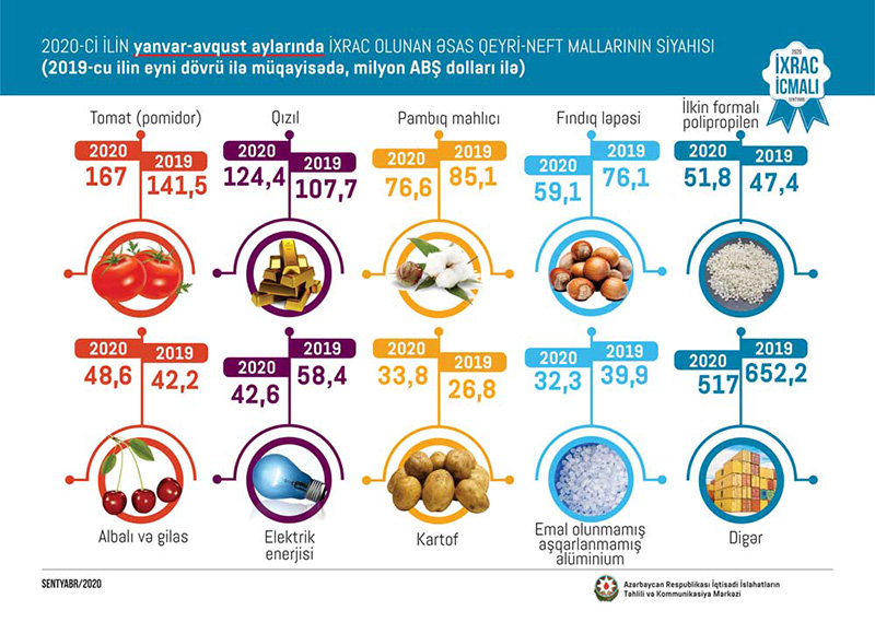 2020-ci ilin yanvar-avqust ayları ərzində ixrac edilən qeyri-neft sektoruna aid malların siyahısında pomidor (167 milyon ABŞ dolları) birinci, qızıl (sikkə kəsilməsində istifadə olunmayan, digər emal olunmamış formalarda – 124,4 milyon ABŞ dolları) ikinci və pambıq mahlıcı (78,6 milyon ABŞ dolları) üçüncü olub.