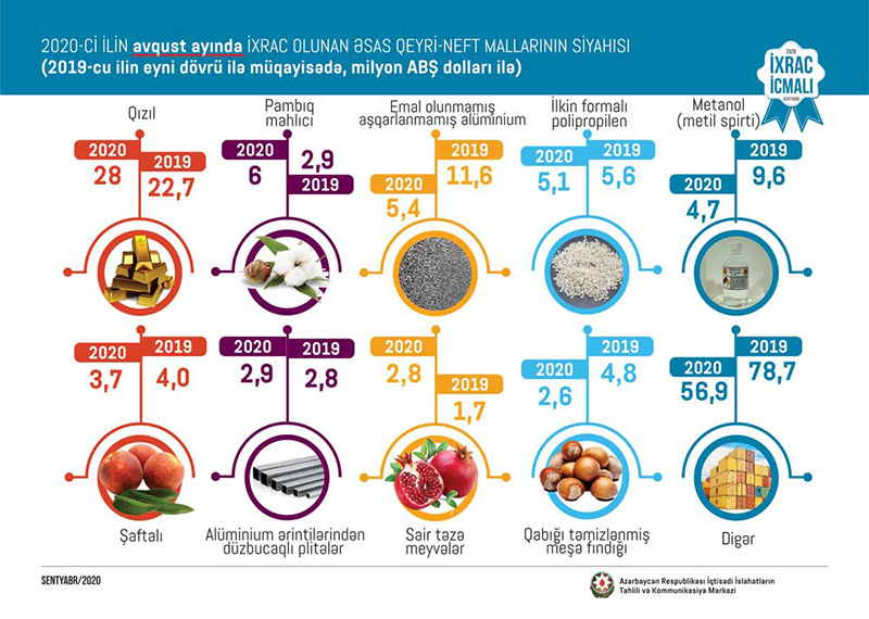 2020-ci ilin avqust ayında qeyri-neft sektoru üzrə ixracda qızıl (28 milyon) birinci, pambıq mahlıcı (6 milyon ABŞ dolları) ikinci, emal olunmamış aşqarlanmamış alüminium – (5,4 milyon ABŞ dolları ) üçüncü yerdə qərarlaşıb.