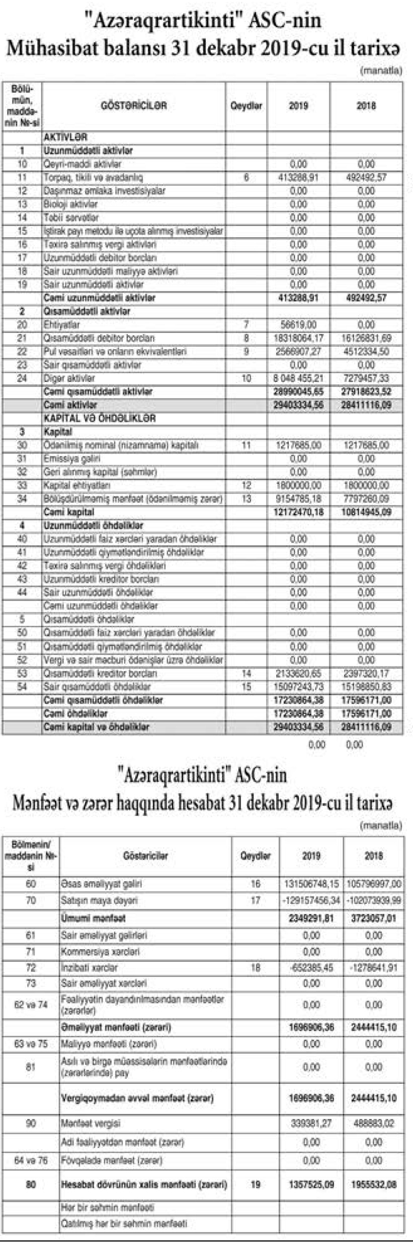 “Azəraqrartikinti” ASC 2019-cu ili 1 milyon 357 min manat xalis mənfəət ilə başa vurub. Bu, 2018-ci illə müqayisədə 598 min manat və ya 30,5% azdır. Şirkət 2018-ci ili 1 milyon 955 min manat xalis mənfəət ilə bağlamışdı.
