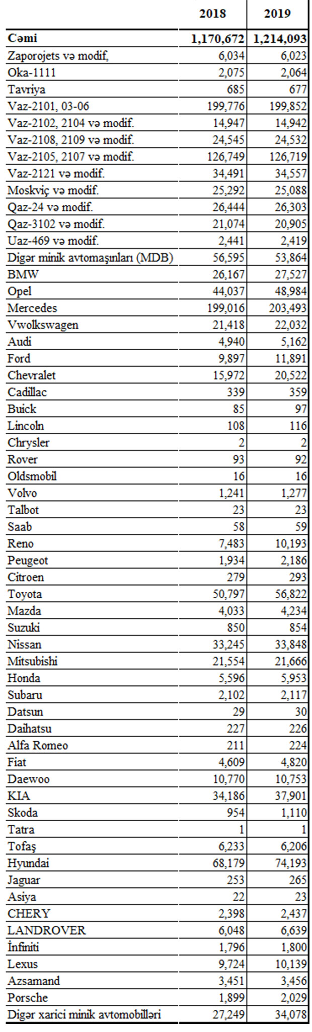 2019-cu ildə Azərbaycanda qeydiyyata alınmış Opel avtomobillərinin sayı 4 min 947 ədəd, Chevrolet avtomobillərinin sayı 4 min 550 ədəd, Mercedes - Benz avtomobillərinin sayı 4 min 477 ədəd, KİA avtomobillərinin sayı 3 min 715 ədəd, Reno avtomobillərinin sayı isə 2 min 710 ədəd artıb.