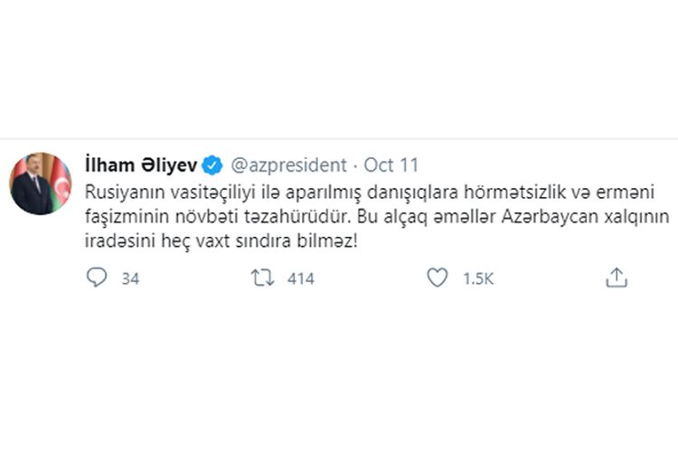 Prezident digər tvitində qeyd edib ki, Ermənistan atəşkəs rejimini kobud şəkildə pozub, Gəncə şəhərinin dinc sakinlərini raketlə atəşə tutub. Bu, müharibə cinayətidir və Cenevrə konvensiyalarının kobud şəkildə pozulmasıdır".