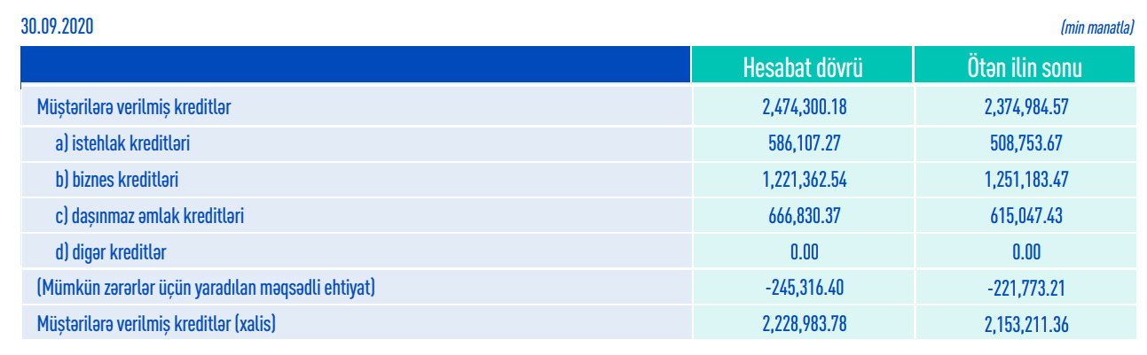 Belə ki, 2020-ci ilin 9 ayı ərzində müştərilərə verilmiş cəmi istehlak kreditləri 77 milyon 354 min manat artaraq 586 milyon 107 min manata, daşınmaz əmlak kreditləri 51 milyon 783 min manat artaraq 666 milyon 830 min manata çatıb.