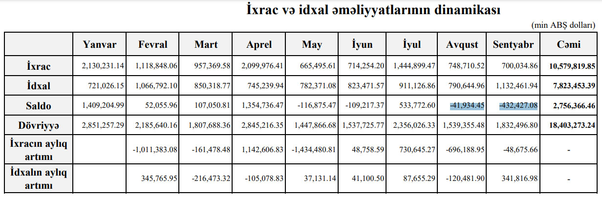 Avqustda Azərbaycanın ixracı 748 milyon 710 min dollar, idxalı 790 milyon 644 min dollar, mənfi saldo 41 milyon 934 min dollar təşkil etmişdi. Mənfi saldonun artmasına ixracın azalması ilə bərabər idxalın artması səbəb olub.