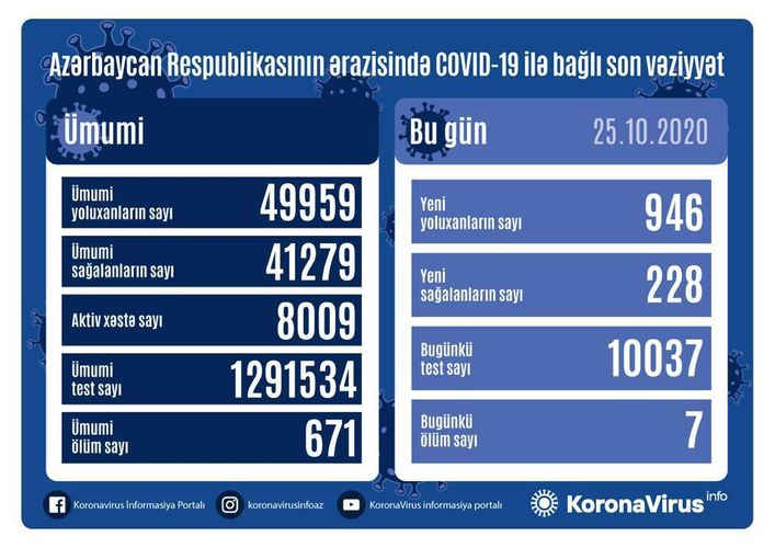 Qeyd edək ki, 24 Oktyabrda 792 yoluxma faktı qeydə alındığı açıqlanmışdı.