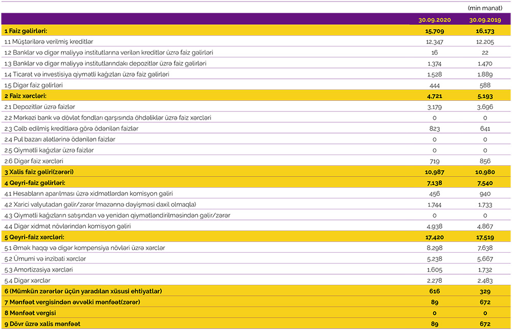 Müqayisə üçün qeyd edək ki, 2020-ci ilin 9 ayında Azər-Türk Bankın cəmi əməliyyat gəlirləri 23 milyon 713 min manat, cəmi əməliyyat xərcləri isə 22 milyon 712 min manat təşkil etmişdi. Gəlirlər xərcləri üstələdiyindən Bankın 1 milyon 1 min manat əməliyyat mənfəəti formalaşmışdı. Bank əməliyyat mənfəətindən mümkün zərərlər üçün yaradılan xüsusi ehtiyatlara 329 min manat ayırdığından həmin dövrü 672 min manat xalis mənfəət ilə bağlamışdı.