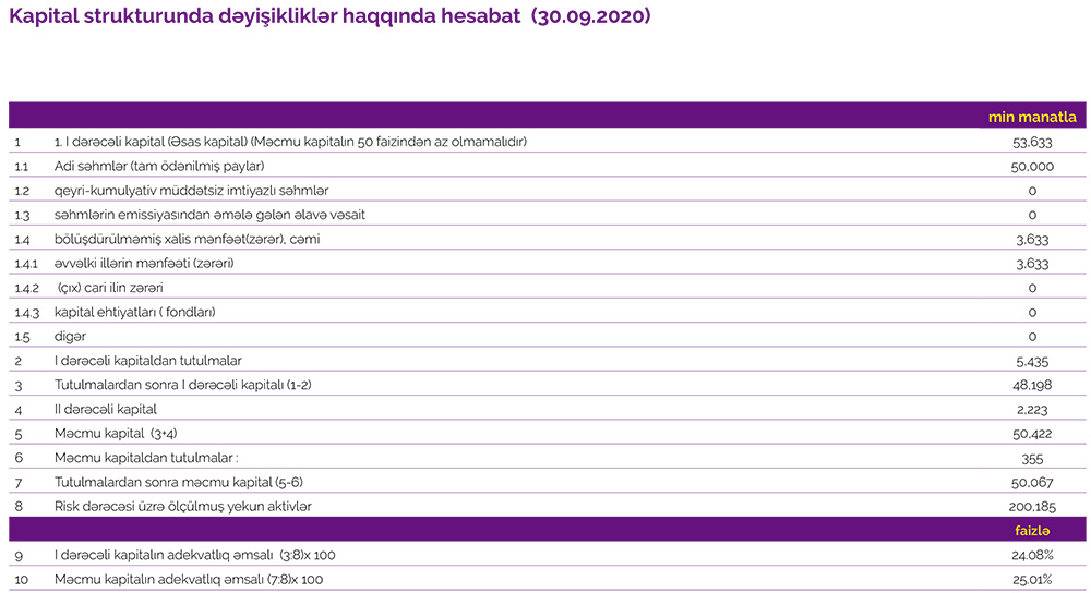 30 Sentyabr 2020-ci il tarixində Azər-Türk Bank 50 milyon 67 min manat məcmu kapitala malik olub.