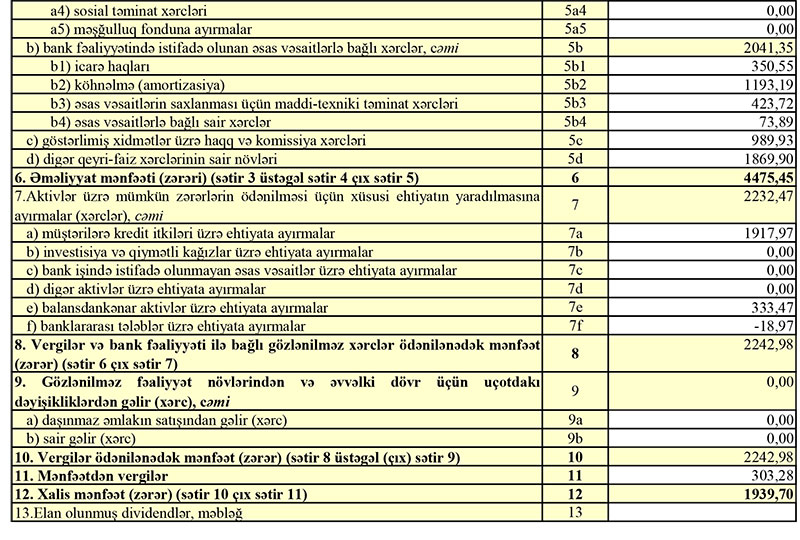 Müqayisə üçün qeyd edək ki, 2019-cu ilin yanvar - sentyabr dövründə “Ziraat Bank Azərbaycan”ın cəmi əməliyyat gəlirləri 15 milyon 779 min manat, cəmi əməliyyat xərcləri 11 milyon 840 min manat, gəlirlər xərcləri üstələdiyindən əməliyyat mənfəəti 3 milyon 939 min manat təşkil etmişdi. Bank əməliyyat mənfəətinin 844 min manatını aktivlər üzrə mümkün zərərlərin ödənilməsi üçün xüsusi ehtiyatın yaradılmasına ayırmış və 86 min manat mənfəət vergisi ödəmişdi. Nəticədə “Ziraat Bank Azərbaycan” həmin dövrü 3 milyon 8 min manat xalis mənfəət ilə bağlamışdı.