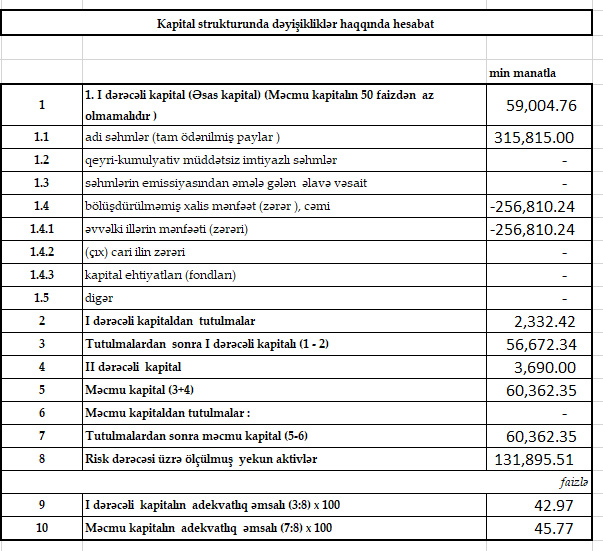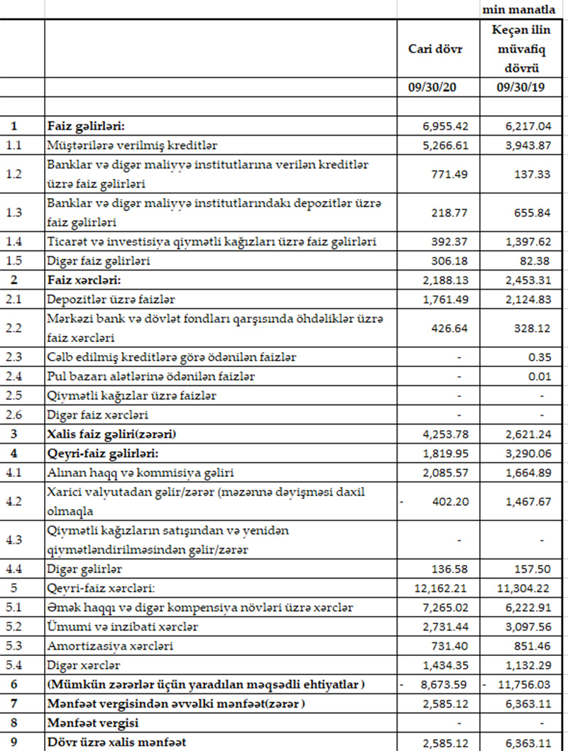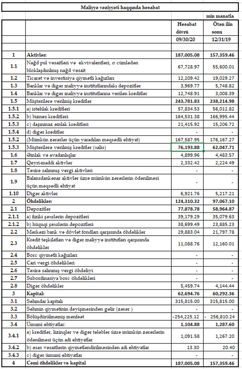 Cari ilin 9 ayı ərzində müştərilərə verilmiş kreditlər 62 milyon 48 min manatdan 76 milyon 194 min manata yüksəlib. Cəmi kreditlərdəki artım daşınmaz əmlak kreditlərinin artması ilə əlaqədardır.