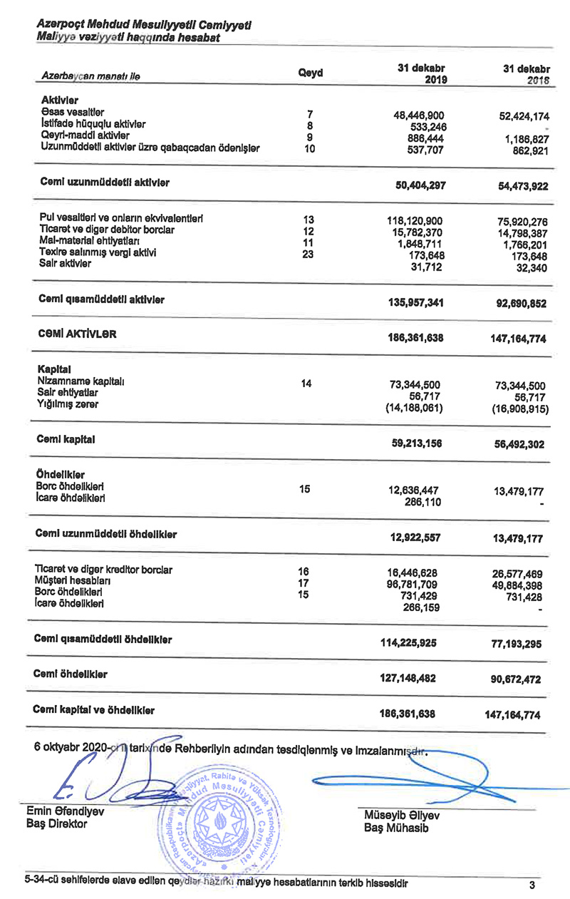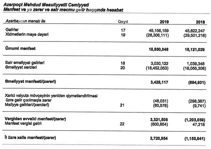 Nəqliyyat, Rabitə və Yüksək Texnologiyalar Nazirliyinə məxsus “Azərpoçt” MMC 2019-cu ili 2 milyon 721 min manat xalis mənfəətlə başa vurub. Halbuki, şirkət 2018-ci ildən 1 milyon 156 min manat zərərlə çıxmışdı.