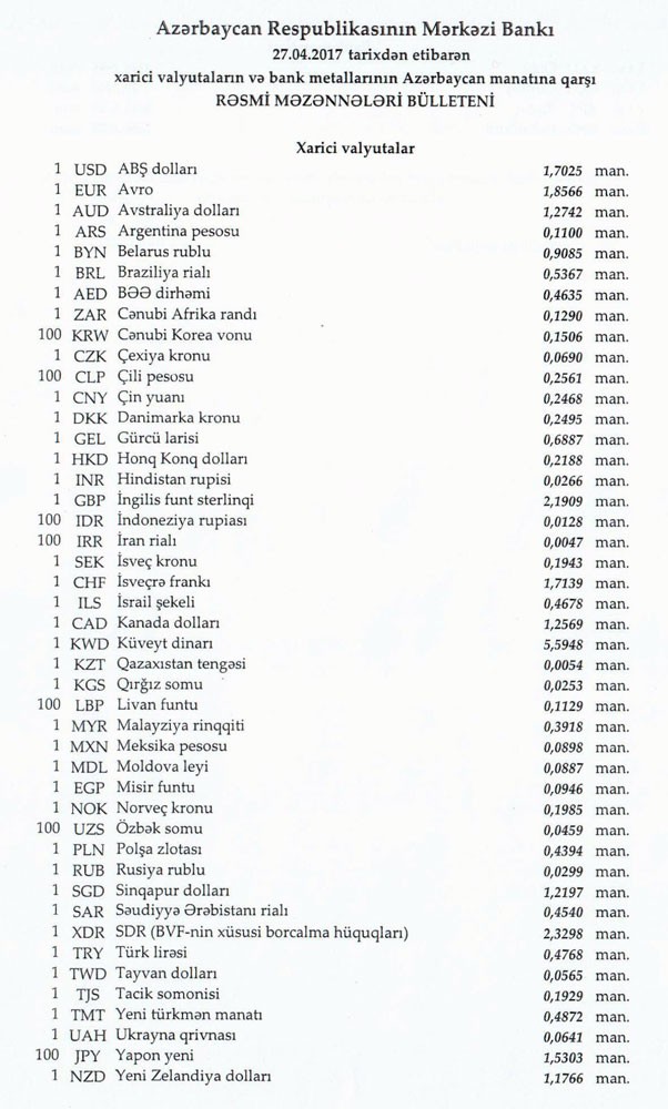 Aprelin 27-nə Mərkəzi Bankın açıqladığı rəsmi Dollar/manat məzənnəsi Aprelin 26-sı ilə müqayisədə dəyişməyərək 1,7025 manat olub, Avro/manat məzənnəsi isə 1.8566 manata düşüb.