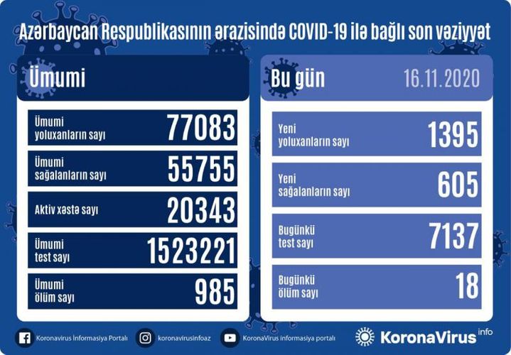 Son 24 saatda Azərbaycan Respublikasında koronavirus (COVID-19) infeksiyasına 1395 yeni yoluxma faktı qeydə alınıb, 605 nəfər müalicə olunaraq sağalıb və evə buraxılıb.