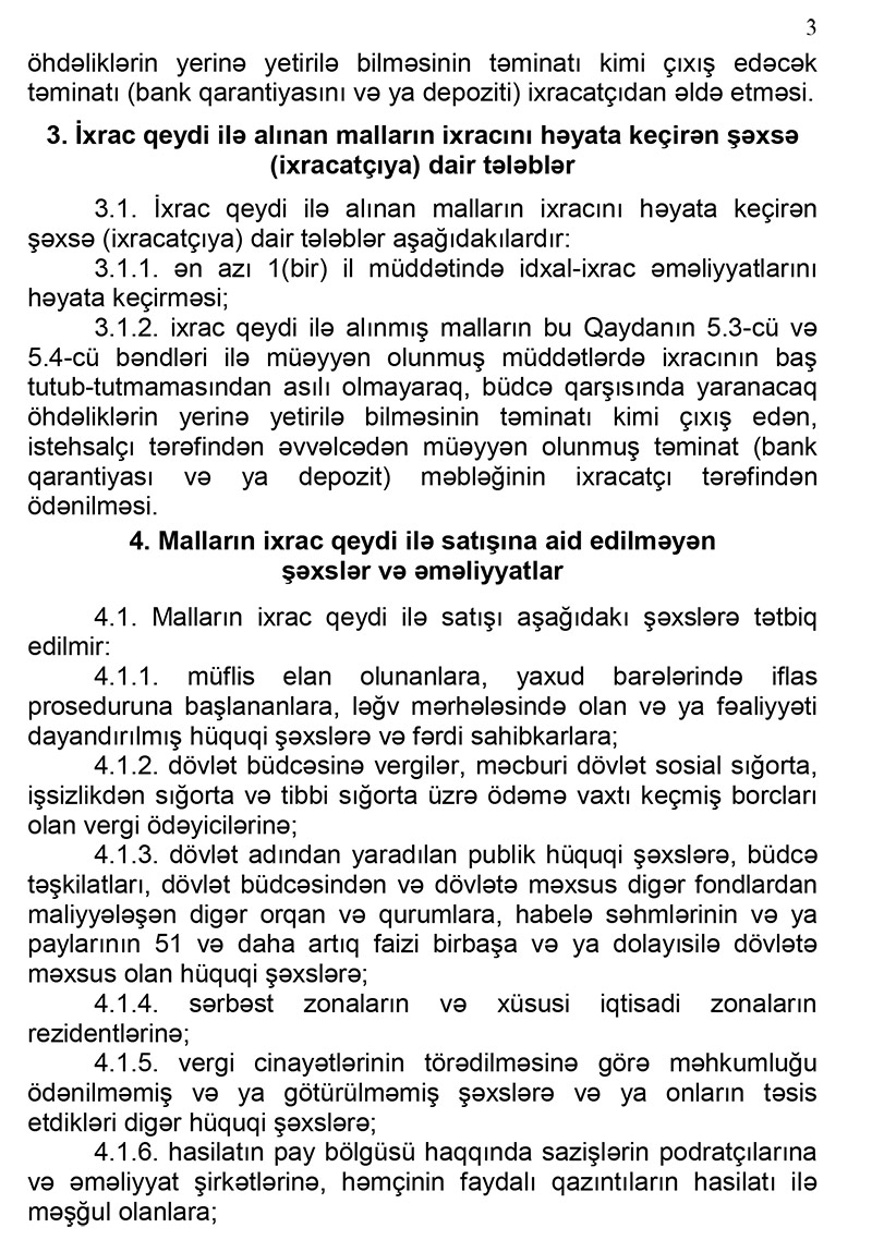 Bu barədə Nazirlər Kabinetinin 2020-ci il 14 noyabr tarixli “Malların ixrac qeydi ilə satışı Qaydası” Qərarının izahında deyilir.