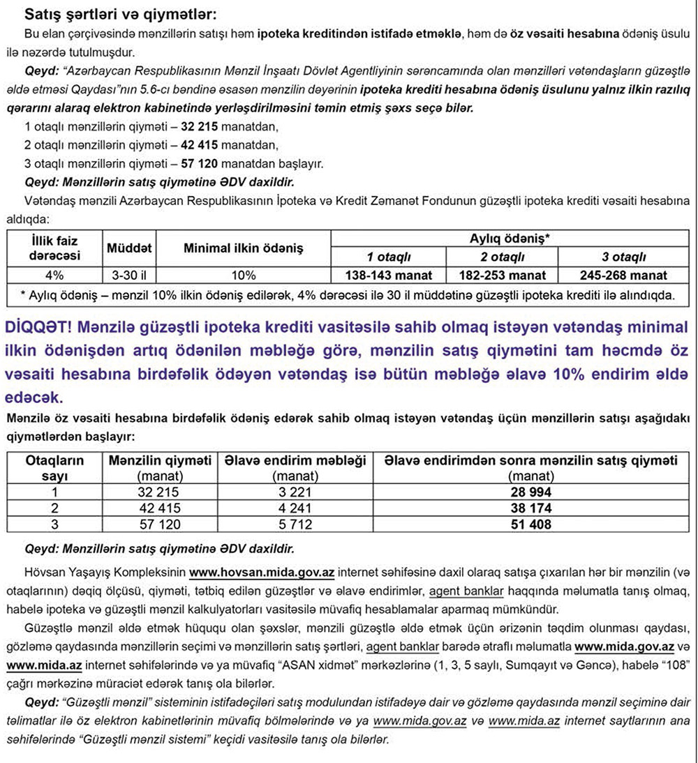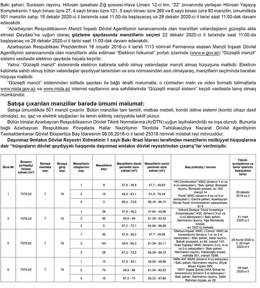 Mənzil İnşaatı Dövlət Agentliyi (MİDA) Hövsan Yaşayış kompleksi üzrə 501 mənzilin güzəştlə satışa çıxarılacağını elan edib.