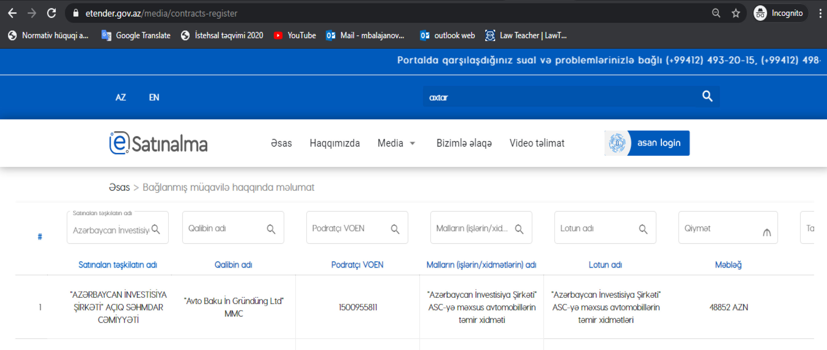 Vahid dövlət satınalmaları portalında bildirilir ki, tenderin qalibi "Avto Baku İn Gründüng Ltd" MMC-dir.