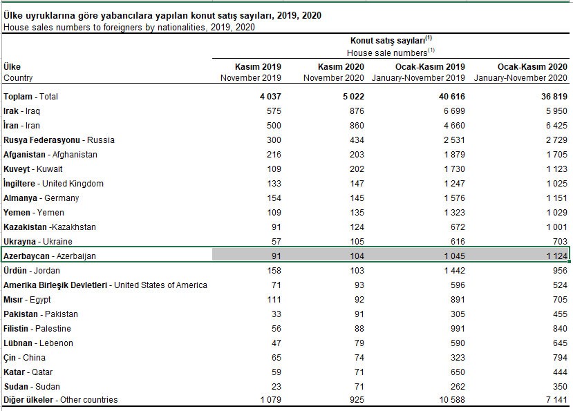2020-ci ilin Yanvar-Noyabr dövründə (11 ayda) isə azərbaycanlılar Türkiyədə 1124 mənzil alıblar. 2019-cu ilin eyni dövründə bu say 1045 idi.