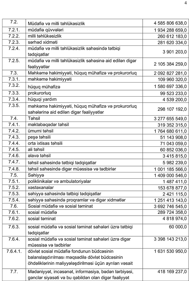 Növbəti ilin dövlət büdcəsinin xərclərinin strukturuna daxil olan cari xərclərə ümumi xərclərin 63,1 faizi həcmində və ya 18 milyard 14,0 milyon manat , əsaslı xərclərə 29,2 faizi həcmində və ya 8 milyard 330,3 milyon manat, dövlət borcuna xidmətlə bağlı xərclərə 7,7 faizi həcmində və ya 2198,8 milyon manat vəsait yönəldiləcəkdir.