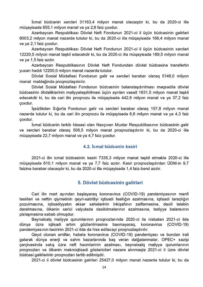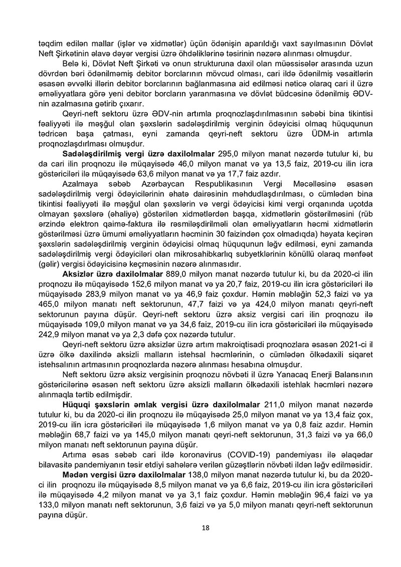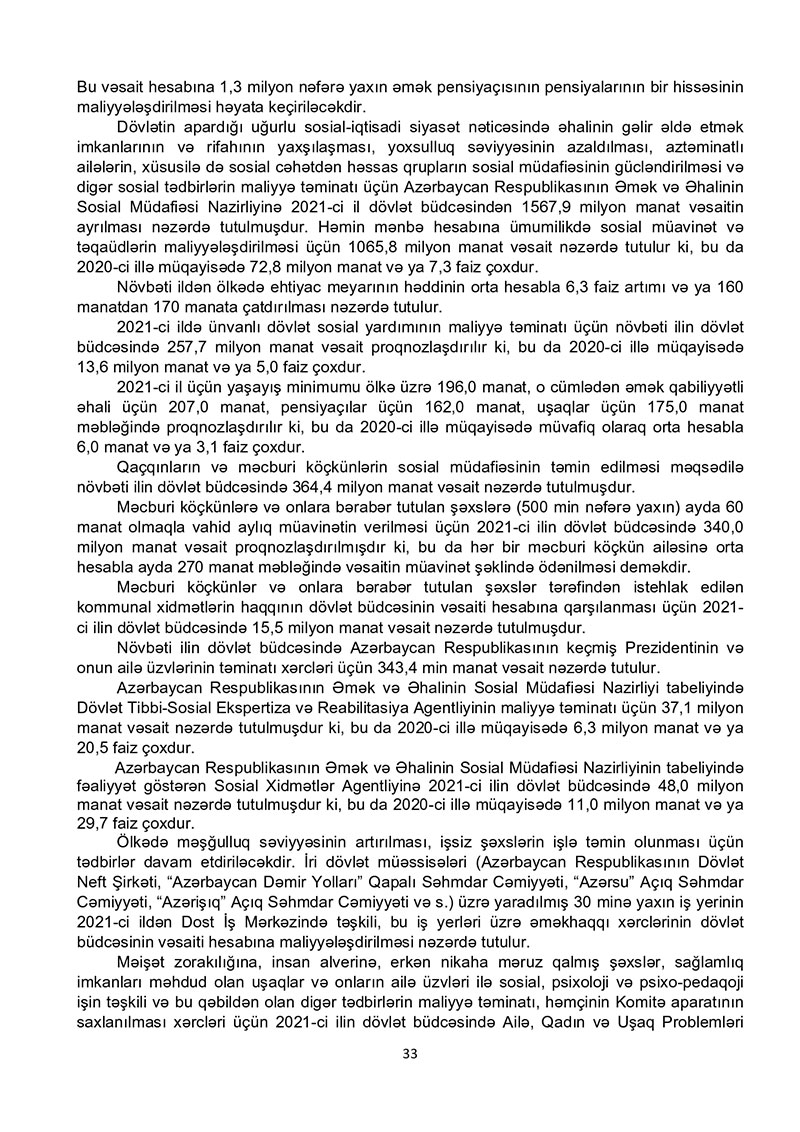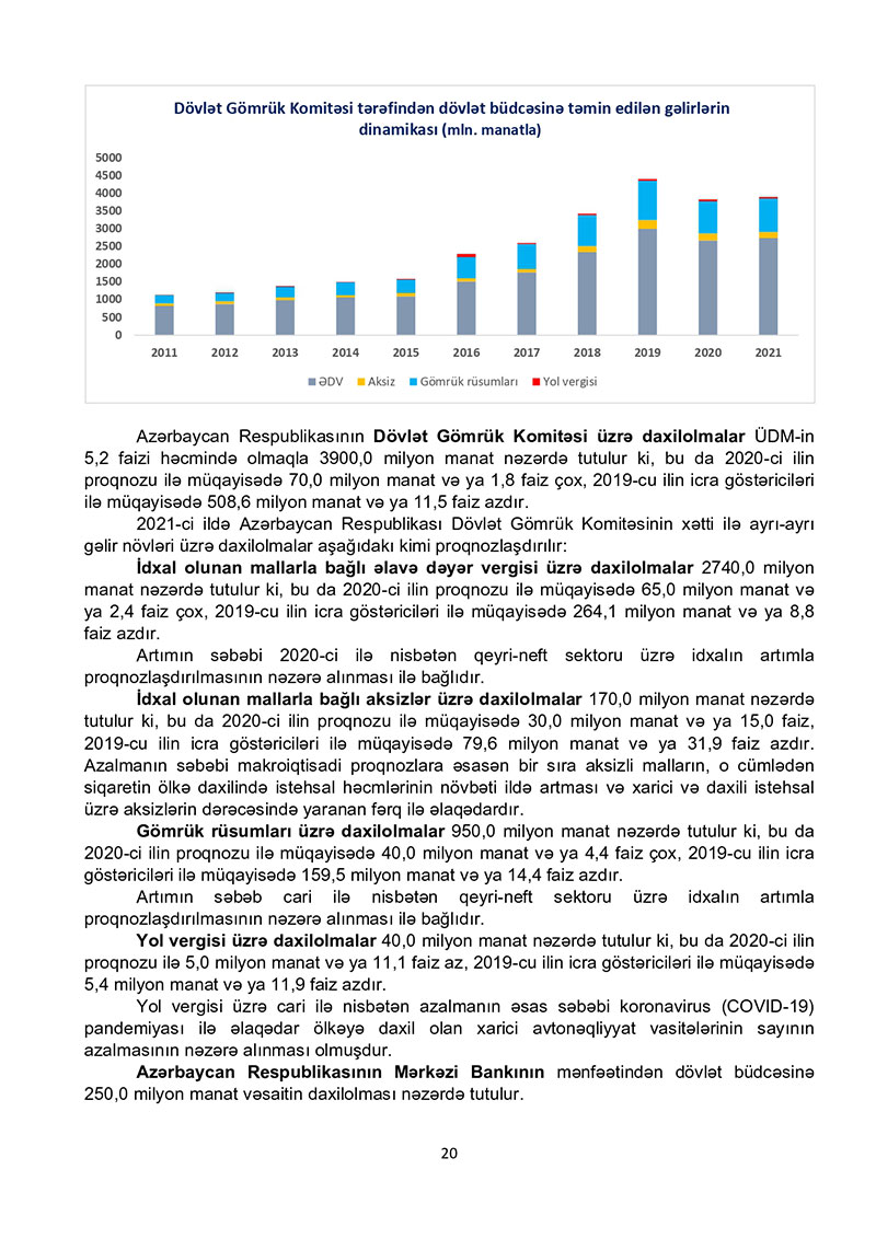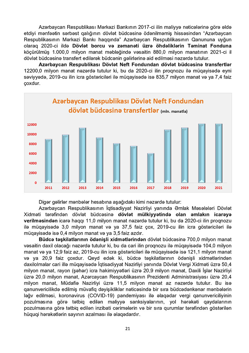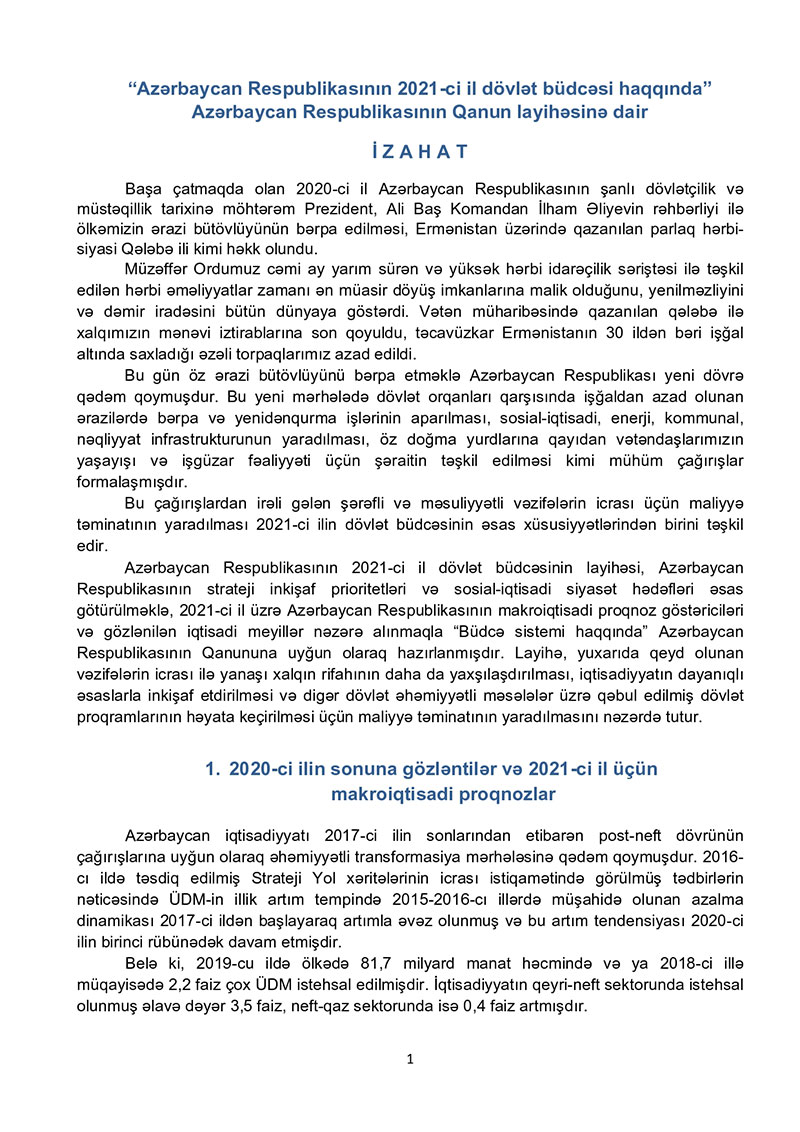 “Azərbaycan Respublikasının 2021-ci il dövlət büdcəsi haqqında” Azərbaycan Respublikasının Qanun 2021-ci il dövlət büdcəsi layihəsinə dair İZAHAT
