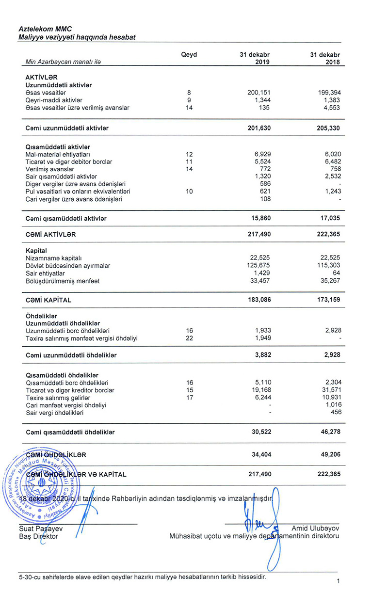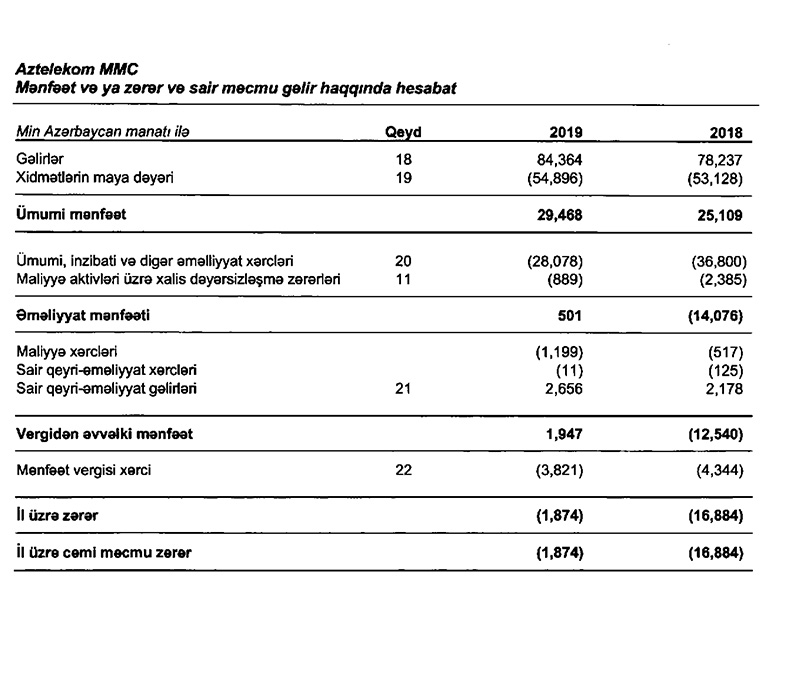 Dövlətə məxsus rabitə operatoru “Aztelekom” MMC 2019-cu ili 1 milyon 874 min manat xalis zərər ilə başa vurub. Bu, 2018-ci illə müqayisədə 9 dəfə azdır. Dövlət şirkəti 2018-ci ili 16 milyon 884 min manat xalis zərər ilə başa vurmuşdu.