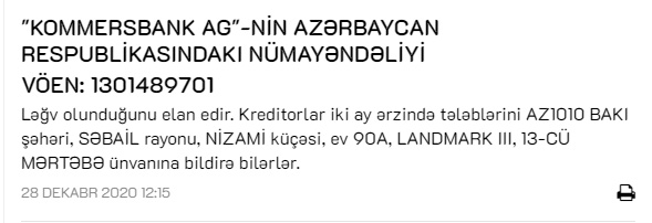 Almaniya bankı "Kommersbank AG"nin Azərbaycan Respublikasındakı nümayəndəliyi ləğv olunduğunu elan edir.