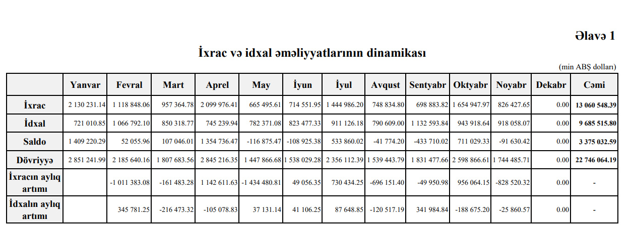 Xarici ticarət saldosu ötən ilin 11 ayında 5 milyard 918 milyon 675 min dollar ikən, cari ilin 11 ayında 3 milyard 375 milyon 033 min dollar təşkil edib.