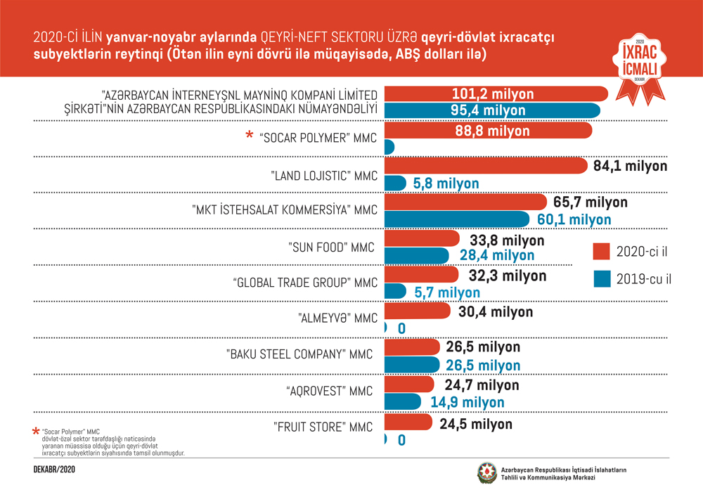 Marja xəbər verir ki, 2020-ci ilin 11 ayı üzrə hazırlanan qeyri-dövlət ixracatçı subyektlərin reytinqində ilk onluqda aşağıdakı şirkətlər təmsil olunurlar: