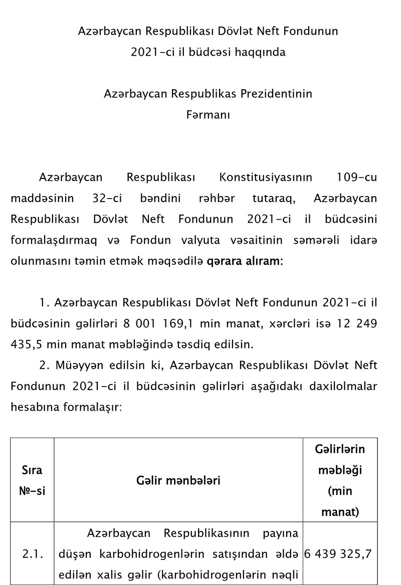 Fərman ilə, Azərbaycan Respublikası Dövlət Neft Fondunun 2021-ci il büdcəsinin gəlirləri 8 milyard 1 milyon 169,1 min manat, xərcləri isə 12 milyard 249 milyon 435,5 min manat məbləğində təsdiq edilib.