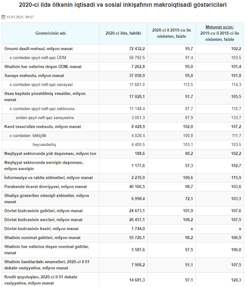 2020-ci ildə Azərbaycanın ümumi daxili məhsulunun (ÜDM) həcmi 2019-cu il ilə müqayisədə 4,3% azalaraq 72 milyard 432,2 milyon manat təşkil edib.