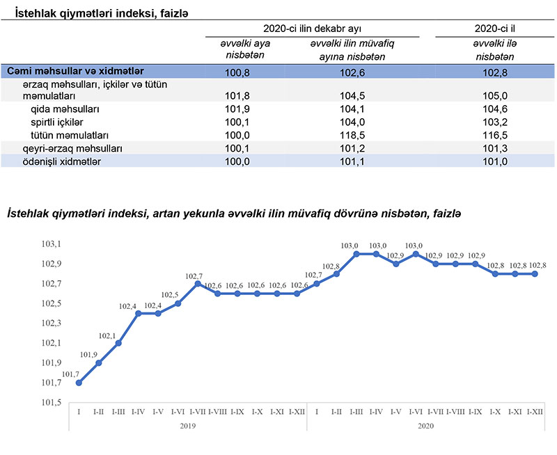 Dövlət Statistika Komitəsinin məlumatına görə, 2020-ci ildə istehlak qiymətləri indeksi 2019-cu ilə nisbətən 102,8 faiz, o cümlədən ərzaq məhsulları, içkilər və tütün məmulatları üzrə 105,0 faiz, qeyri-ərzaq məhsulları üzrə 101,3 faiz, əhaliyə göstərilmiş ödənişli xidmətlər üzrə 101,0 faiz təşkil etmişdir.