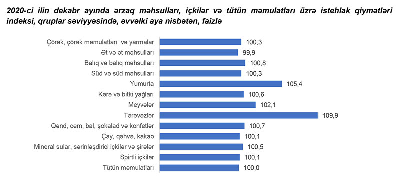 2020-ci ilin dekabr ayında ərzaq məhsulları, içkilər və tütün məmulatları üzrə istehlak qiymətləri indeksi əvvəlki aya nisbətən 101,8 faiz, əvvəlki ilin dekabr ayına nisbətən 104,5 faiz təşkil etmişdir.