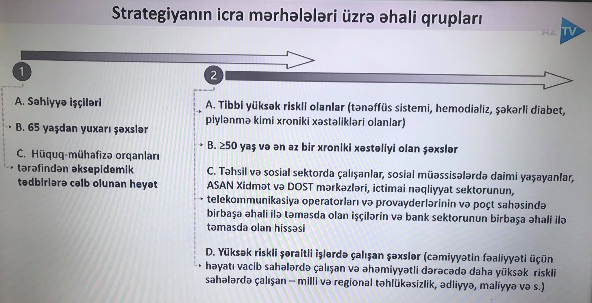 - Təhsil və sosial sektorda çalışanlar, sosial müəssisələrdə daimi yaşayanlar, ASAN Xidmət və DOST mərkəzləri, ictimai nəqliyyat sektorunun, telekommunikasiya operatorları və provayderlərinin və poçt sahəsində birbaşa əhali ilə təmasda olan işçilərin və bank sektorunun birbaşa əhali ilə təmasda olan hissəsi;