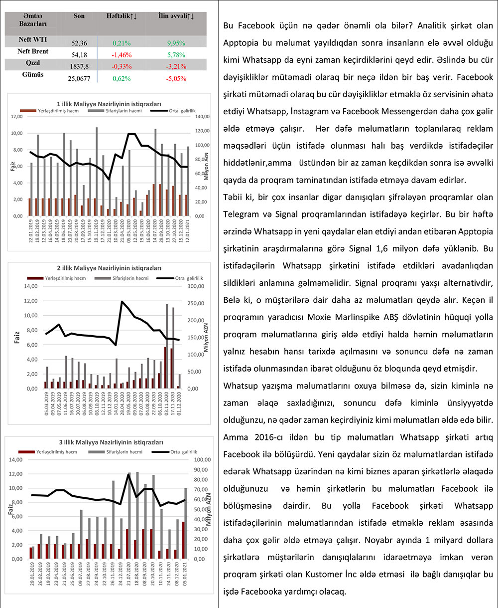 Sonuncu 12 yanvar 2021-ci il 1 illik hərrac zamanı əvvəlcədən 20 milyon AZN təklif olunacağı elan olunmuşdur. Hərrac zamanı 20 milyon təklif qarşılığında 16 investor tərəfindən 27 sifariş olmaqla tələb 98,04 milyon olub. Sifarişlərin gəlirlik intervalı isə 5,79- 10,03% aralığında dəyişib. Yerləşdirmənin nəticəsinə gəldik də, keçirilmiş sonuncu 1 illik hərrac zamanı 30 milyon AZN vəsait orta gəlirlik 5,94% olmaqla yerləşdirilib.