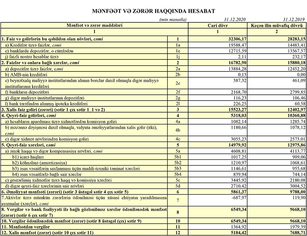 2020-ci ildə 2019-cu illə müqayisədə “Azərbaycan Sənaye Bankı”nın xalis mənfəəti 2 milyon 504 min manat və ya 32,5% azalaraq 5 milyon 184 min manata düşüb.