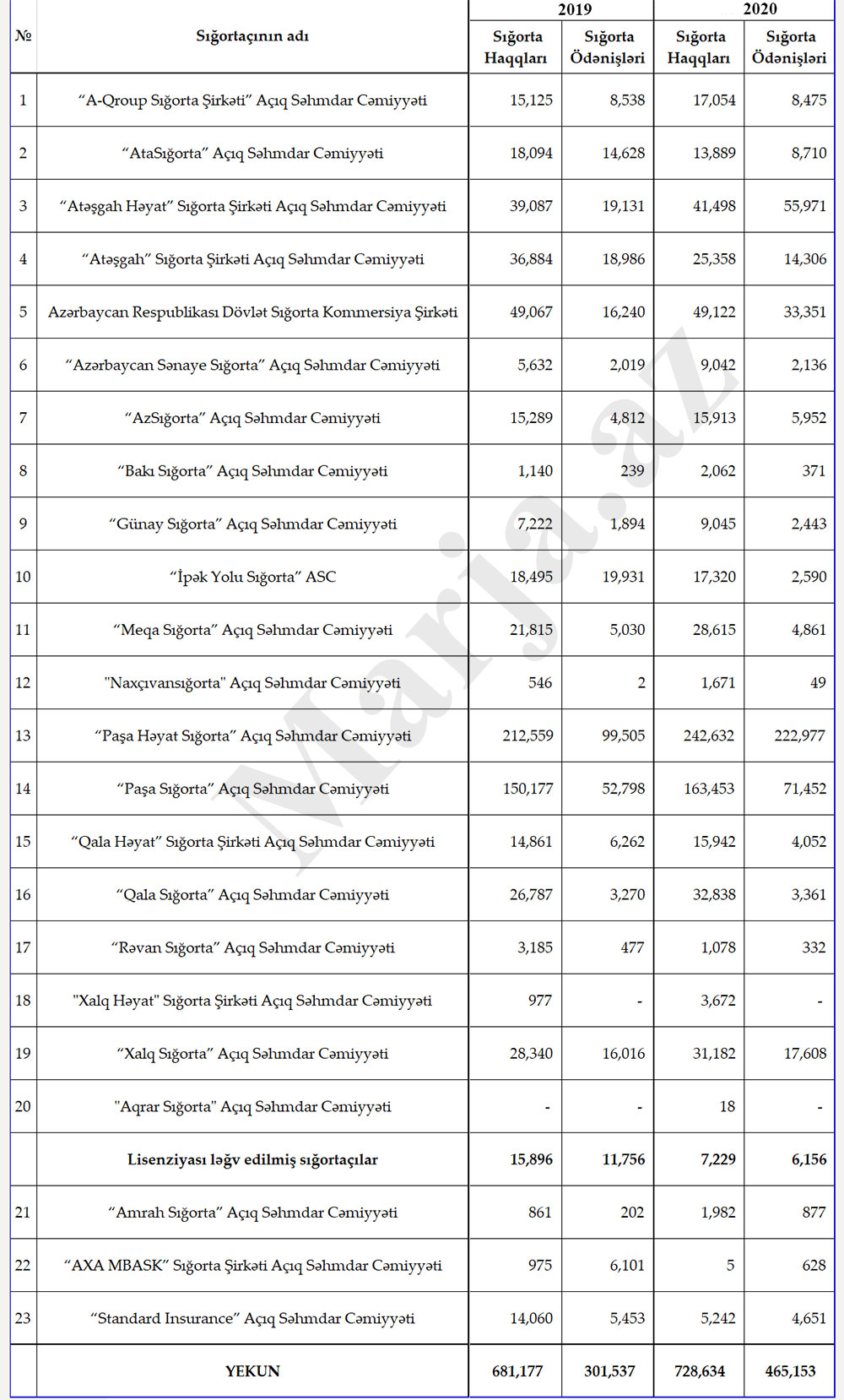 Sığorta şirkətlərinin yığımları və ödənişləri - SİYAHI