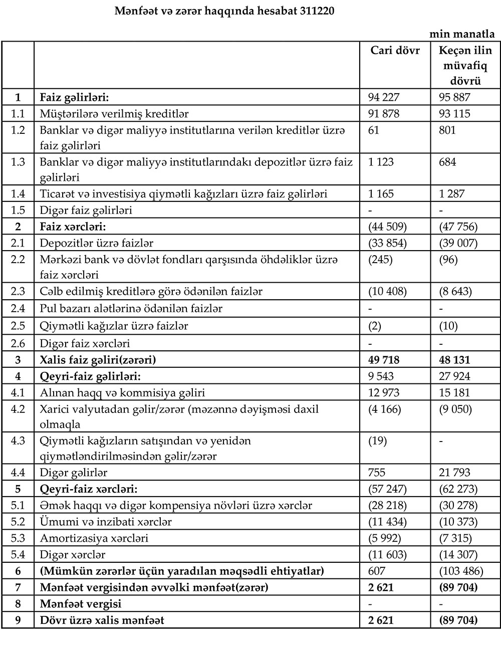 2019-cu ildə 13 milyon 782 min manat təşkil etmiş əməliyyat mənfəəti 2020-ci ildə 2 milyon 14 milyon manat olub. Eyni zamanda, mümkün zərərlər üçün yaradılan məqsədli ehtiyatlardan azad olmuş 607 min manat mənfəətə əlavə edilib. Bank ötən il mənfəət vergisi ödəmədiyindən ili 2 milyon 621 min manat xalis mənfəət ilə başa vurub.