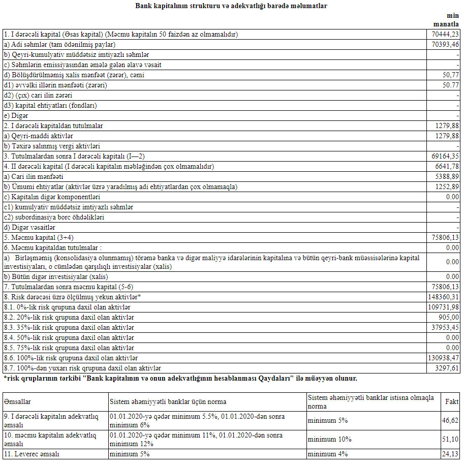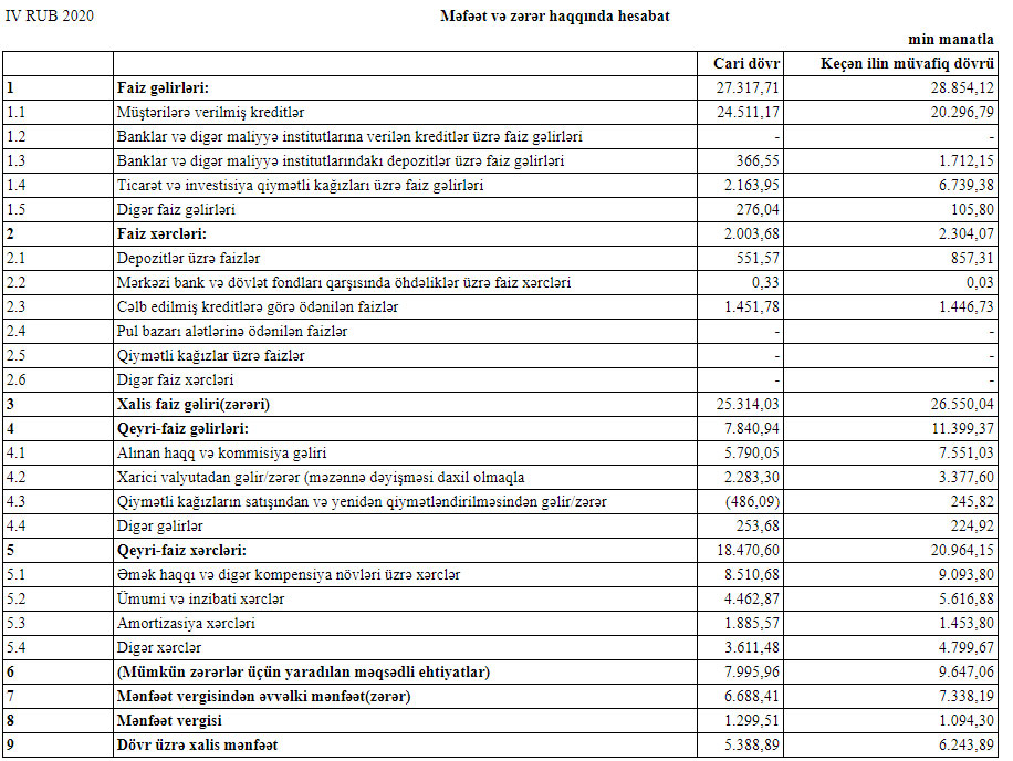 Müqayisə üçün qeyd edək ki, 2019-cu ildə AFB Bankın cəmi əməliyyat gəlirləri 40 milyon 253 min manat, cəmi əməliyyat xərcləri 23 milyon 268 min manat, əməliyyat mənfəəti isə 16 milyon 985 min manat təşkil etmişdi. Bank əməliyyat mənfəətindən 9 milyon 647 min manat mümkün zərərlər üçün yaradılan məqsədli ehtiyatlara ayırmış və 1 milyon 94 min manat mənfəət vergisi ödəmişdi. Beləliklə, AFB Bank 2019-cu ili 6 milyon 243 min manat xalis mənfəətlə bağlamışdı.