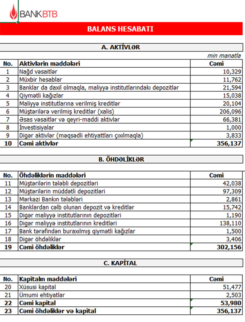31 Dekabr 2020-ci il tarixində Bank BTB 356 milyon 137 min manat cəmi aktivlərə, o cümlədən 206 milyon 96 min manat xalis kredit portfelinə malik olub. Bank 2019-cu ilin sonunda 341 milyon 542 min manat cəmi aktivlərə, o cümlədən 206 milyon 649 min manat xalis kredit portflinə malik idi. Bankın aktivlərinin artması, əsasən, qiymətli kağızlara investisiyaların və digər banklarda depozitlərin artırılması ilə əlaqədardır.