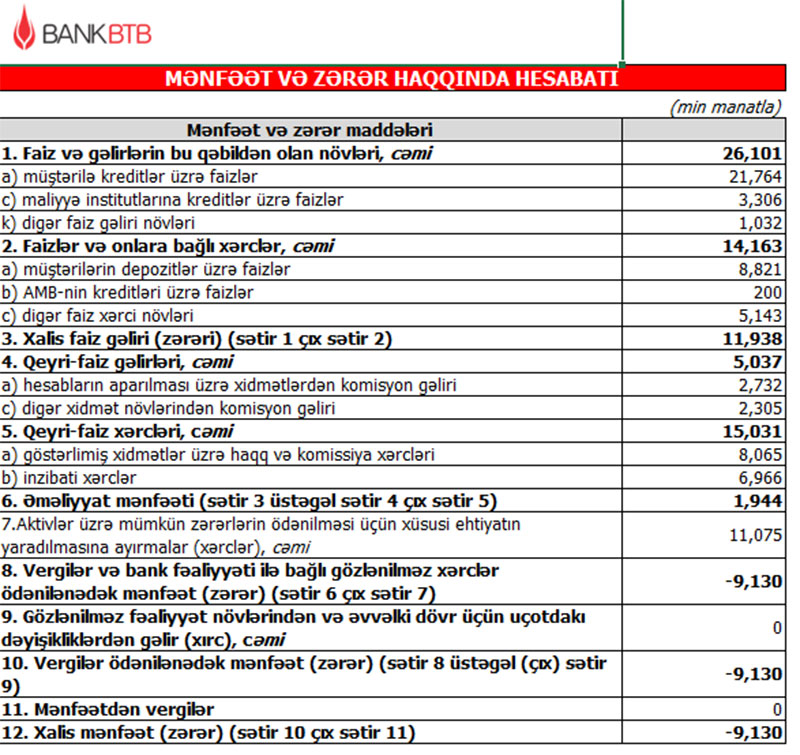 Marja Bankın maliyyə hesabatlarına istinadən xəbər verir ki, 2020-ci ildə Bank BTB-nin cəmi əməliyyat gəlirləri (faiz və qeyri-faiz gəlirləri) 31 milyon 138 min manat, cəmi əməliyyat xərcləri (faiz və qeyri-faiz xərcləri) 29 milyon 194 min manat təşkil edib. Gəlirlər xərcləri üstələdiyindən Bankın 1 milyon 944 min manat əməliyyat mənfəəti yaranıb. Bank aktivlər üzrə mümkün zərərlərin ödənilməsi üçün xüsusi ehtiyatın yaradılmasına 11 milyon 75 min manat ayırdığından ötən ili 9 milyon 130 min manat xalis zərər ilə başa vurub.