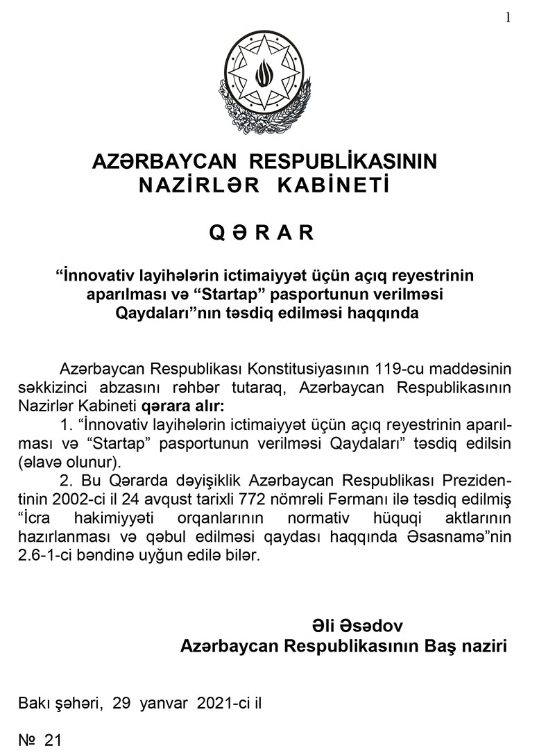 Azərbaycan Respublikasının Nazirlər Kabineti “İnnovativ layihələrin ictimaiyyət üçün açıq reyestrinin aparılması və “Startap” pasportunun verilməsi Qaydaları”nın və “Startapın müəyyən olunması meyarları”nın təsdiq edilməsi barədə qərarlar qəbul edib.