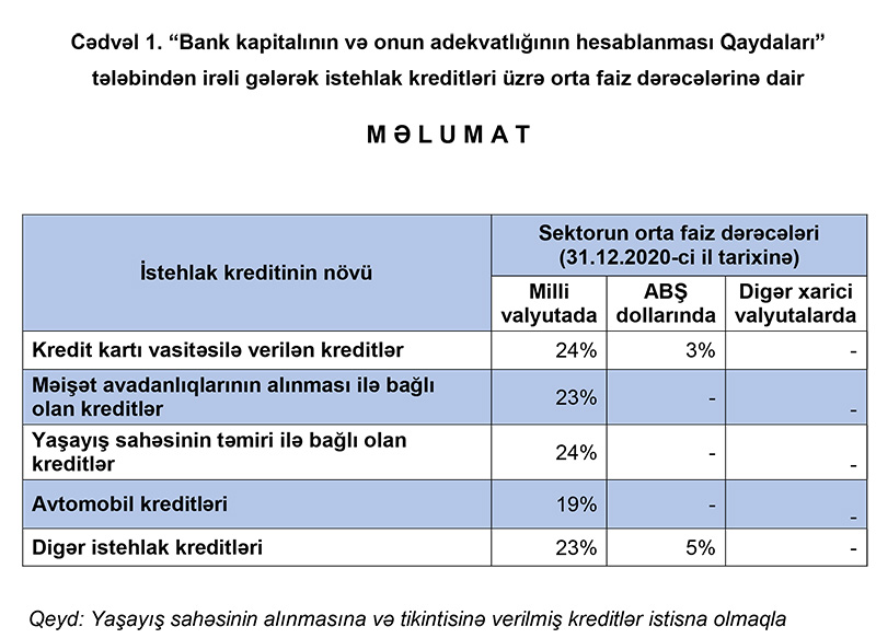 Orta faiz dərəcəsi kredit kartı vasitəsilə verilən kreditlər üzrə 24%, məişət avadanlıqlarının alınması ilə bağlı olan kreditlər üzrə 23%, yaşayış sahəsinin təmiri ilə bağlı olan kreditlər üzrə 24%, avtomobil kreditlər üzrə 19%, digər istehlak kreditləri üzrə 23% olub.