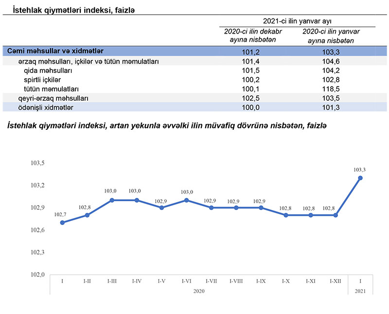 Azərbaycanda illik inflyasiya 208%-dən 3.3%-ə yüksəlib.İstehlak bazarında qiymətlərin dəyişməsi haqqında 2021-ci ilin yanvar ayında istehlak qiymətləri indeksi 2020-ci ilin yanvar ayına nisbətən 3,3 faiz, o cümlədən ərzaq məhsulları, içkilər və tütün məmulatları üzrə 4,6 faiz, qeyri-ərzaq məhsulları üzrə 3,5 faiz, əhaliyə göstərilmiş ödənişli xidmətlər üzrə 1,3 faiz artıb.